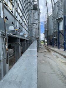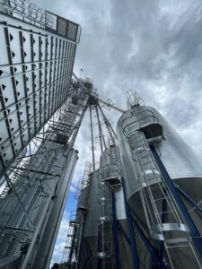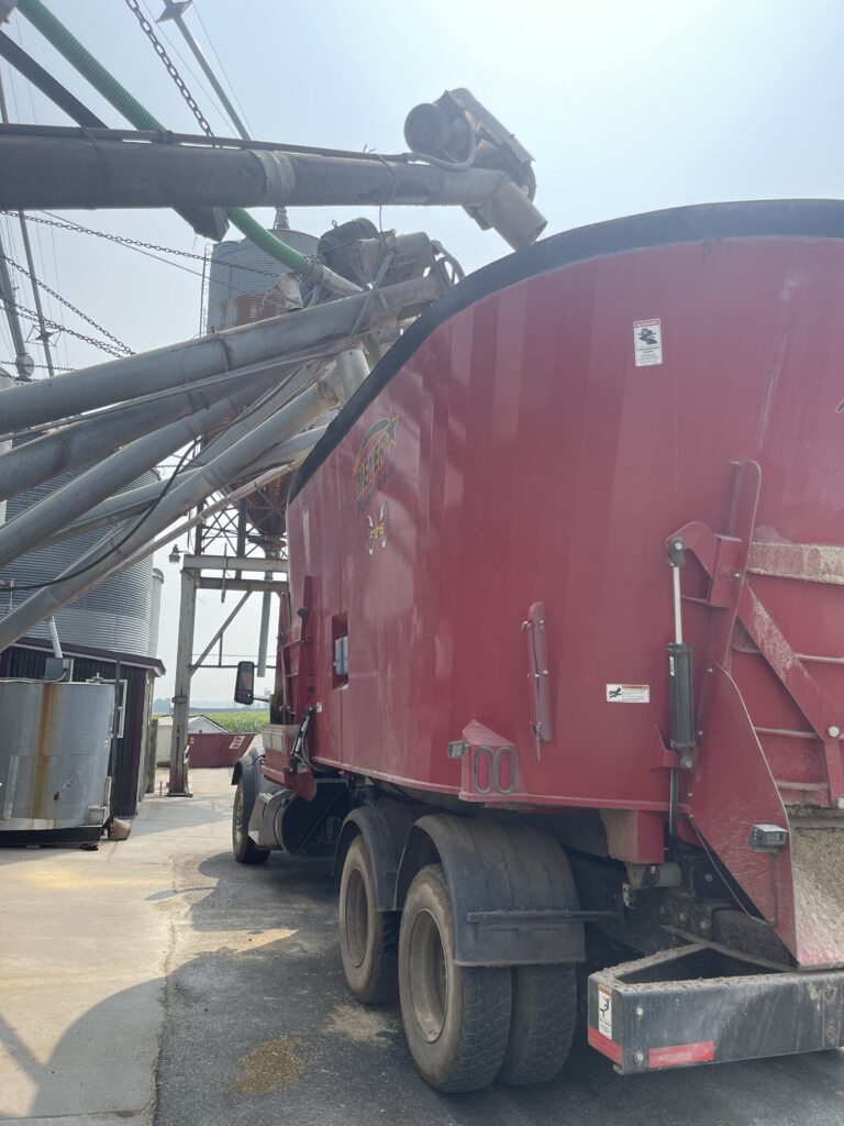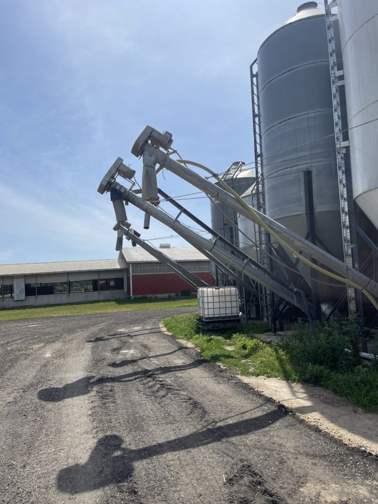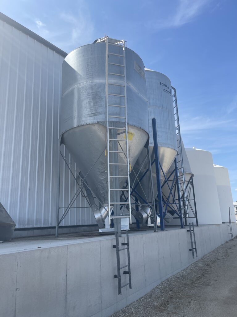 Example of bins located outside of the feed center. This allows for bins to unload into mixers while being filled by an auger truck outside.