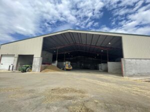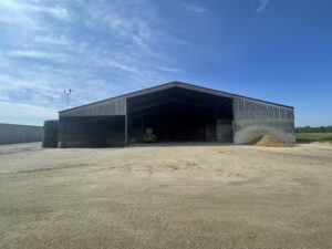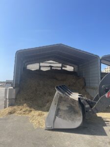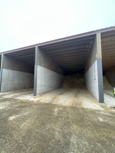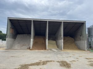 The low pitch of the roof in this deep bayed building makes tub grinding straw and adding other ingredients less wasteful as equipment can get deep into the bay for unloading and minimize commodities blowing away. While the bays aren’t completely utilized for some ingredients, the over-building of this design minimizes shrink relative to other monoslope sheds. The large apron in front of the building allows trucks to easily back into the bays to deliver.