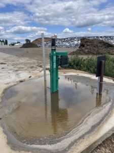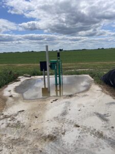 This farm utilizes a very simple leachate setup. There is a holding pit at the lower corner of the silage pad. During heavy rains, the excess rainwater flows out into the buffer strip. When the holding pit is full, it is pumped out using a 7.5 hp motor.