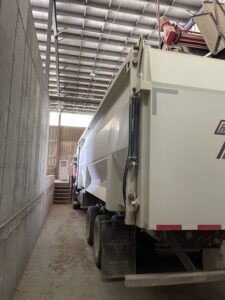 The farm uses a Supreme International 1200T vertical mixer. Bin socks are positioned to hit the center of the stationary mixer. Once feed is mixed, it travels up a 4’ (1.2 m) wide belt that is driven by a 20hp electric motor to the Roto-Mix delivery truck. Feed is discharged to the delivery truck in less than 5 minutes. The truck is parked so that the driver can exit the truck and have direct access to the stairs. This design is a non-drive through pit, requiring the truck to pull in and back out. It also has a flat approach, which is much easier on equipment than if the loading pit had a ramp.