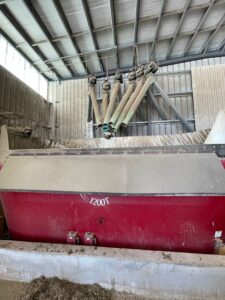 The farm has 6, 52-ton bins for dry commodity storage. Dry commodities and liquids are transferred into the commodity shed and unloaded near the back of the mixer to avoid getting hit by the loader when loading forages. These are 10” (25 cm) augers. The farm has incorporated the Easy Automation system into their feed center to further automate their feeding process. This system automatically adds correct weights from their feeding software (EZ-feed) for automated commodity loading. The program works off the TMR mixer scale head so only one ingredient can be added at a time to get accurate weights. This type of automation system can be set up to integrate with other feeding programs dependent on if the program is willing to interface. It also tracks the remaining inventory left in the bins.