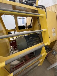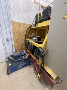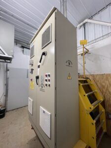 The room is ventilated with a side overhead door to control temperatures in the summertime. A 200 hp electric motor runs the PTO driven mixer, a 3-phase power system. The blue hydraulic pump shown runs the doors on the mixer and was added after initial installation as the 2hp pump that came with the mixer opened the doors extremely slowly.