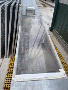 Window for grain unloading system to see grain/belt moving while unloading into dump pit.