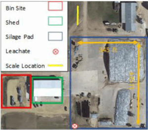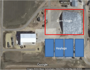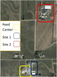 This farm in southeast Minnesota milks 1400 cows. The feed center provides feed for all mature cows and heifers. Animals are located on two separate sites as indicated in the picture below. The feed center is centrally located with plans for expansion.