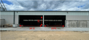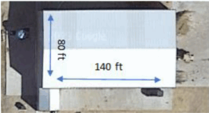 Dimensions of commodity shed (80 ft x 140ft or 24 m x 43 m)