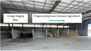 The bays holding home-grown forages are located closest to the mixer, while lower inclusion ingredients are located progressively further away. There is also one bay utilized for bag ingredient storage.