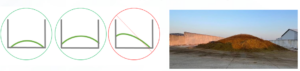 There are several ways to design and shape your pile, depending on the space you have available. Side slope angles should be a minimum of 3’ run to 1’ rise (91 cm run to 31 cm rise). There should also be enough room around the entire pile to provide a clear path for cleaning. Below are a few calculators: