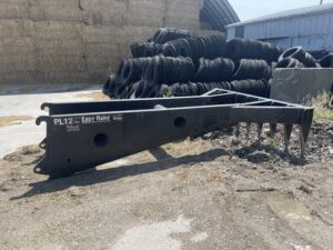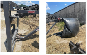 The Stout Equipment Wall Unroller is an attachment on a pivot, allowing plastic to be lifted with a front-loader, makes rolling out over bunker sidewalls easier, and is safer than walking down the wall pulling plastic.