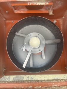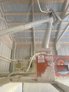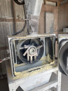 This unit on a dairy in Illinois is run by a 15 hp motor and is fed by a 6” (15 cm) augur. It processes approximately 100 bushels or an estimated 5,600 lb (2,540 kg) per hour. The farm normally lets the unit run the entire feeding shift. The unit was purchased in December 2022 for $4,000 USD and the farm spent an additional $1,600 USD for a variable speed drive on the auger, plus the cost for the shed around the hammer mill. The farm initially fed the mill too fast and couldn’t keep up, however learned if it was fed too slowly, fines would build up and clog the hammer mill. This unit has eliminated the cost of grinding at the local feed mill.