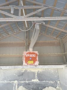 One option to handle grain is to use a leg as pictured here. This setup is a dual-purpose dump pit which serves for unloading during grain harvest and commodity deliveries for the feed center. The unloading conveyor runs from the pit to the grain leg where it’s taken up the leg and dispersed to its proper place of storage. In a harvest situation, the leg will direct the corn to the wet bin to be drier and once dried, transferred to a holding bin (pictured on the left of this image). This system is operated with a computer system that controls the leg system and is integrated with the bin drier system to maximize throughput and efficiency.