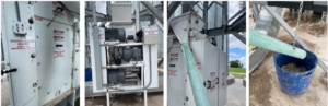 This unit is currently run by a 25 hp motor after the initial 10 hp motor was causing too many issues. The corn for this unit comes from a 10,600-bushel Sukup bin that gets dried corn from the farms’ grain set-up down the road. Through trial and error, the farm found a preferred screen size of 7/64”. Screens are changed out every few months as visual wear is seen. This is an inexpensive maintenance task to keep the unit running smoothly. The farm also built an 11’ (3.4 m) high platform for holding the grinder and providing area to do maintenance on the grinder.