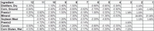 Below is a summary of actual farm data. Routine physical inventories were taken, the feed area was well maintained, and feeder performance was closely monitored. Please note that there is variation month to month and that sometimes there are positive values. These positive values and variation could be from a variety of reasons such as inaccurate estimates of physical inventories, misuse of ingredients, pushing spilled feed into inventory pile, missing/inaccurate delivery/usage data, and more.