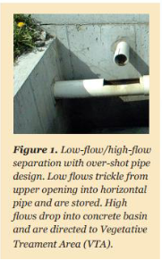 Most leachate collection systems consist of both a leachate collection system and a vegetative treatment area (VTA). These systems are designed with a “first flush” concept, which is believed to maximize the constituent load per volume collected. After the initial first flush collection, flow from feed storage facilities is sent to a secondary treatment, commonly a VTA.