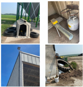 Other animals, including deer, raccoons, rats, mice, and others can also cause issues around the feed center. Some ideas to help control wildlife include noise makers, inflatables, or even solar-powered electric fencers. Keeping the area clean around forage pads can be a great starting place. Keep weeds and grass to a minimum around silage piles to reduce damage from wild animals that may chew plastic. Inspect plastic on a regular basis and immediately repair any holes or damage found to limit spoilage.