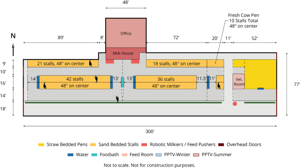 - Naturally-ventilated barn oriented east-west and situated for future expansion to the south with an additional “half” of the barn