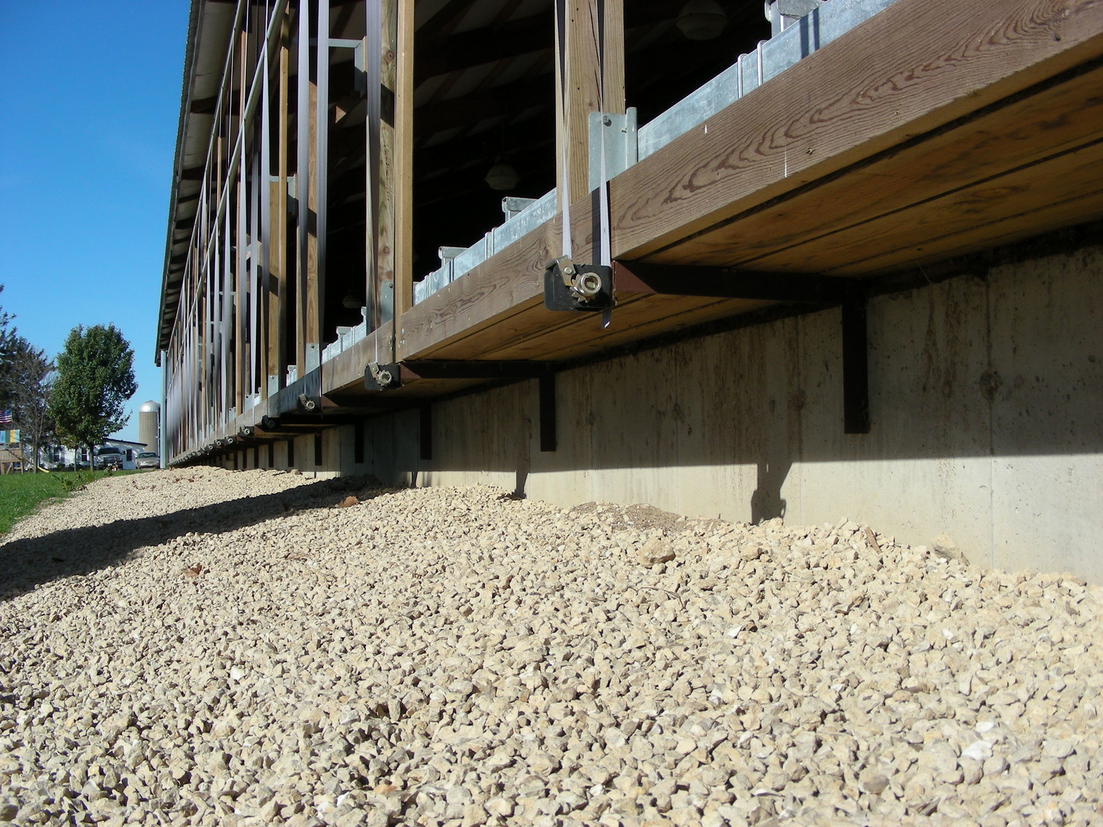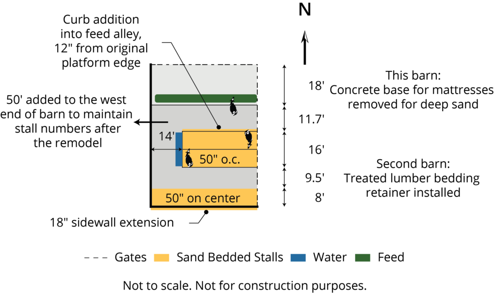 Two lactating cow barns with 3-row pens were remodeled from mattress stalls for deep sand bedding. An 18-inch lunge space addition was built on to the sidewalls of both barns. The head-to-head stall platforms in the first barn were extended 1’ into the feed alley, having removed the concrete mattress stall base and pouring a new curb for deep sand bedding, to accommodate larger, mature Holstein cows. Additionally, single beam-mounted freestall divider loops were installed at 50” on center for the mature cows. A 4×4” treated lumber bedding retainer was anchored to the existing stall platforms in the second barn, which now houses the smaller first lactation Holstein cows, with new divider loops installed at 48” on center.