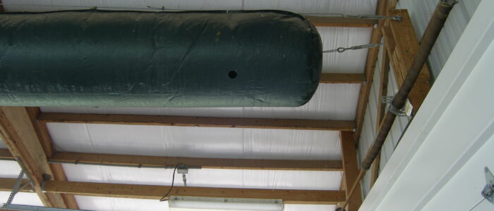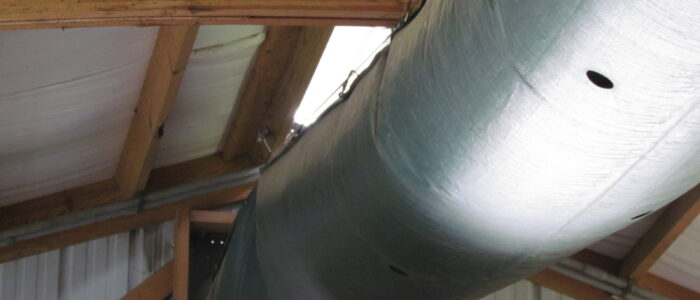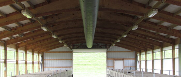 - Positive pressure ventilation tubes run constantly in occupied barns to supplement natural ventilation achieved with tall, curtain sidewalls. Pens are set away from the sidewalls by 3.5 ft (1.1 m) to avoid drafts of cold air on the calves coming in through the top opening in the curtain.
