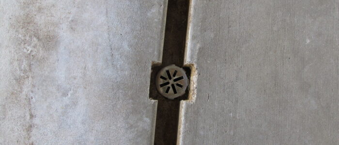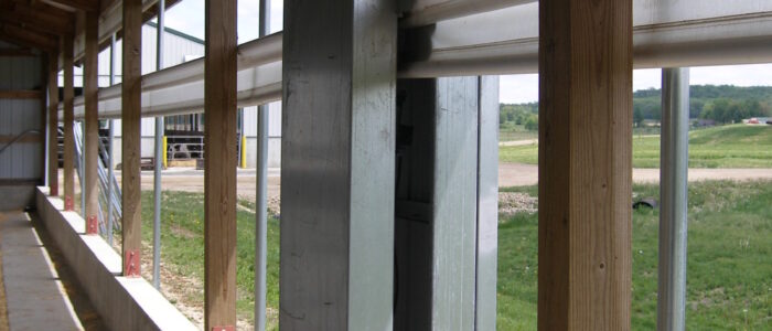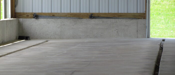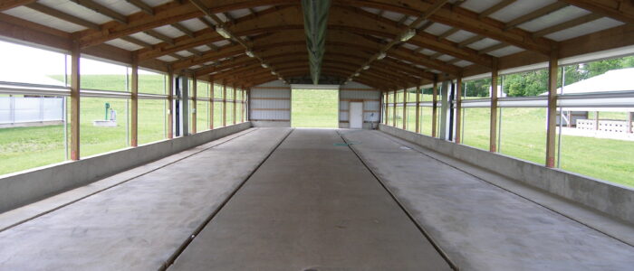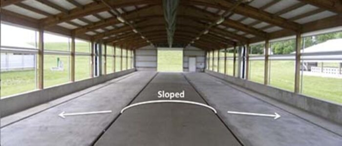 - Concrete floor is graded from center-outward to promote drainage to small (2 in, 5 cm) gutters in front of and behind pens.