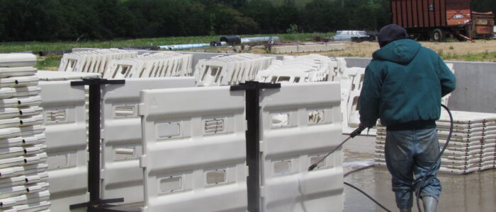 - Calf pen panels are washed and sanitized in an outdoor wash rack area located between the barns when weather permits and in a large, indoor area during winter.