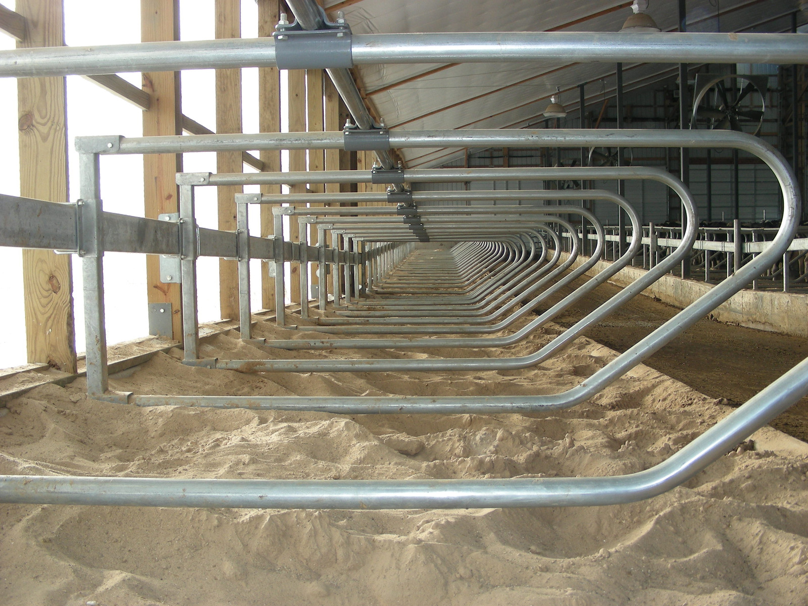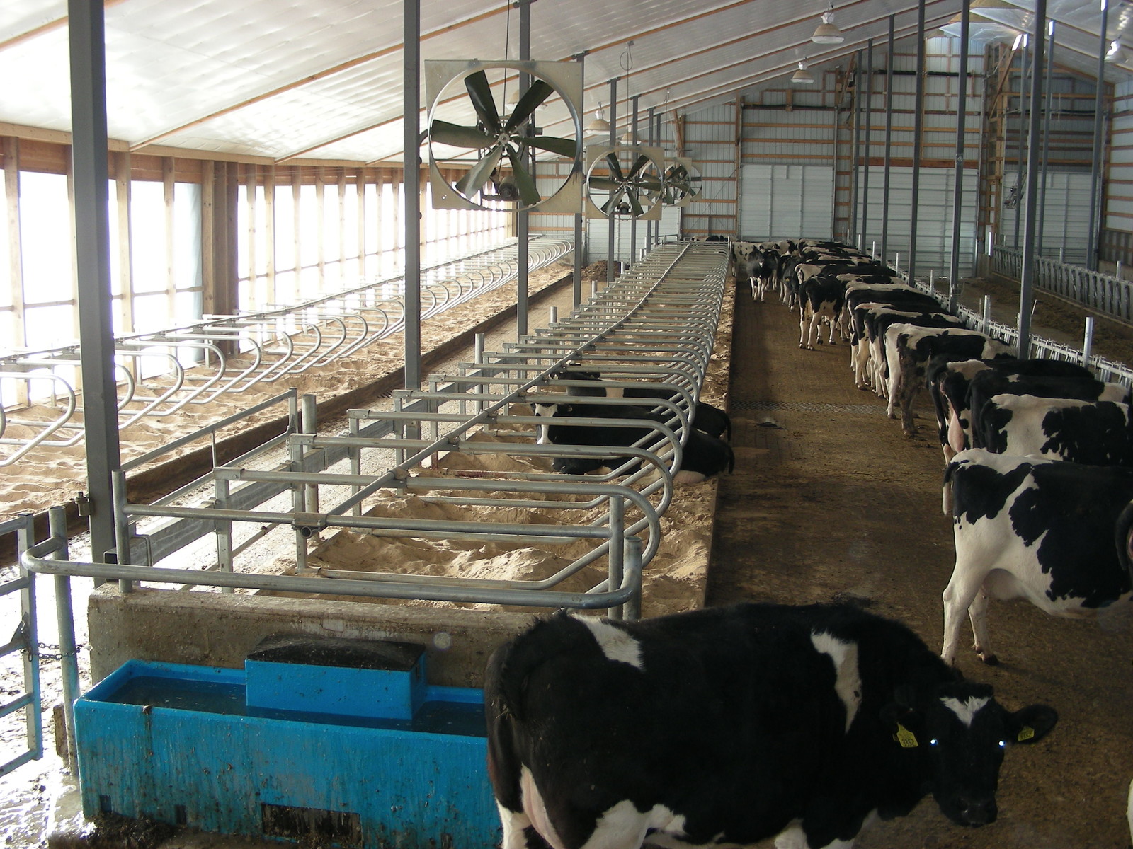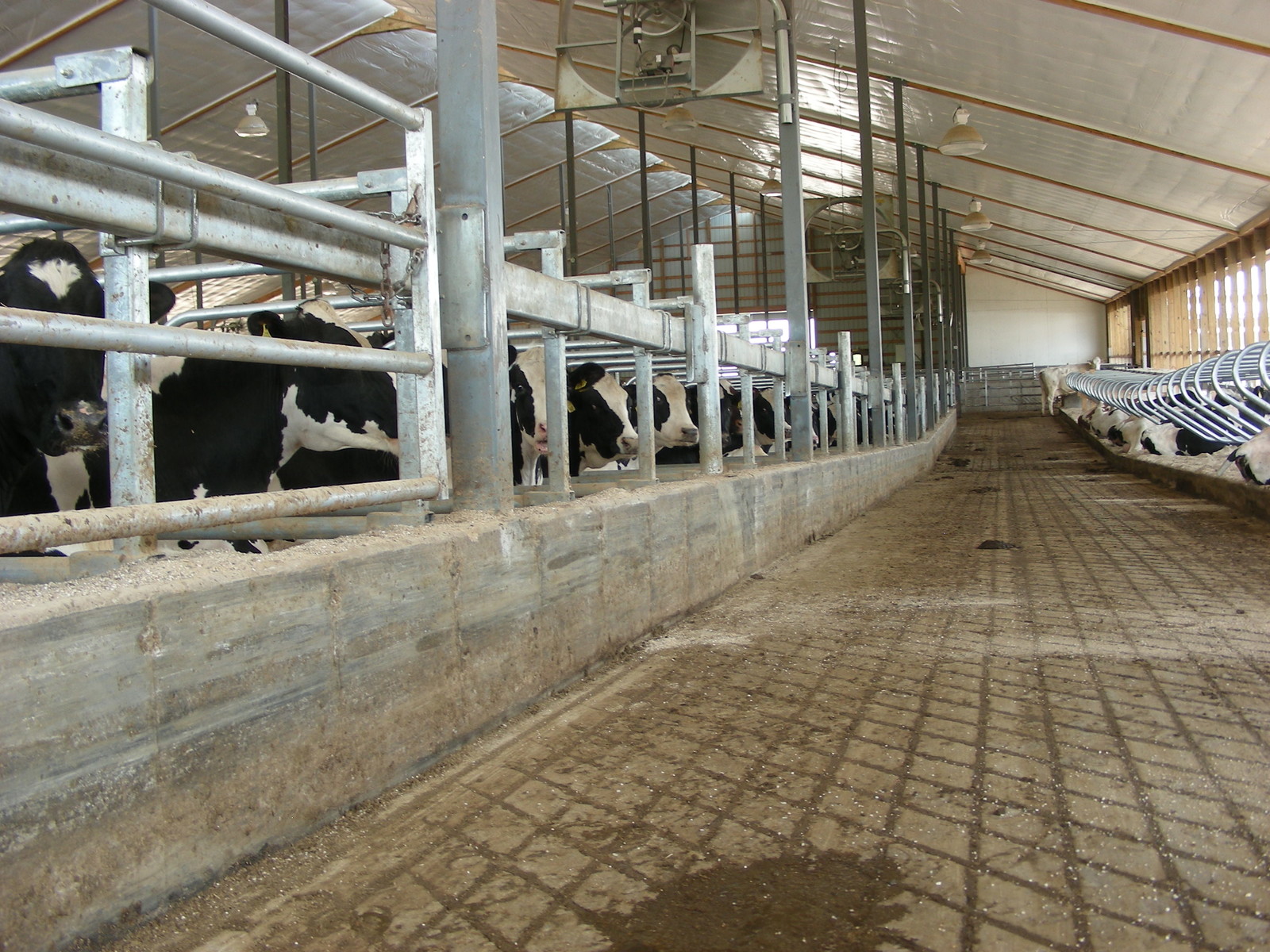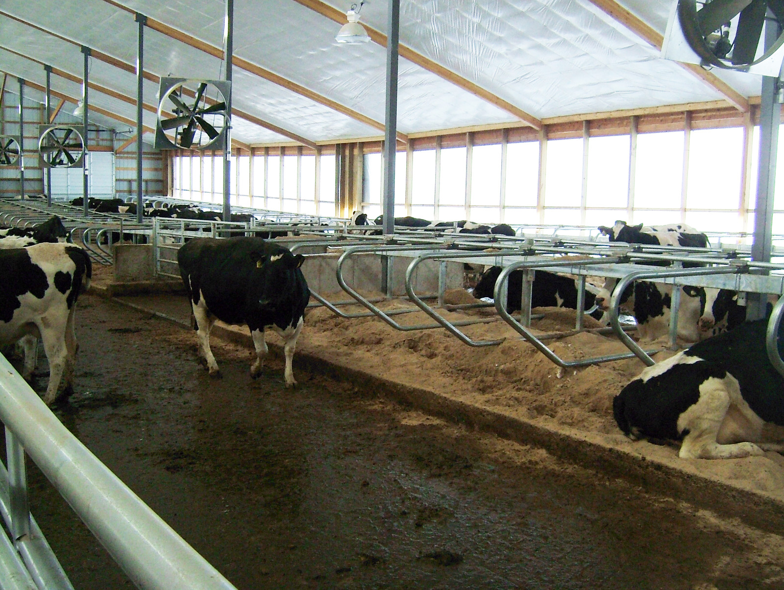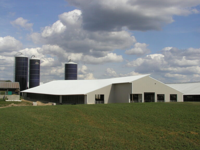 Expanded new transition cow barn housing far dry, prefresh and maternity cows. 5-row barn with 3-row far dry pen and a 2-row head to tail layout sand bedded freestall prefresh pen for a mixed group of heifers and mature cows. Just in time calving with Johne’s control calving pen. Sand bedded freestalls with Norbco loops and a single beam mounting system.