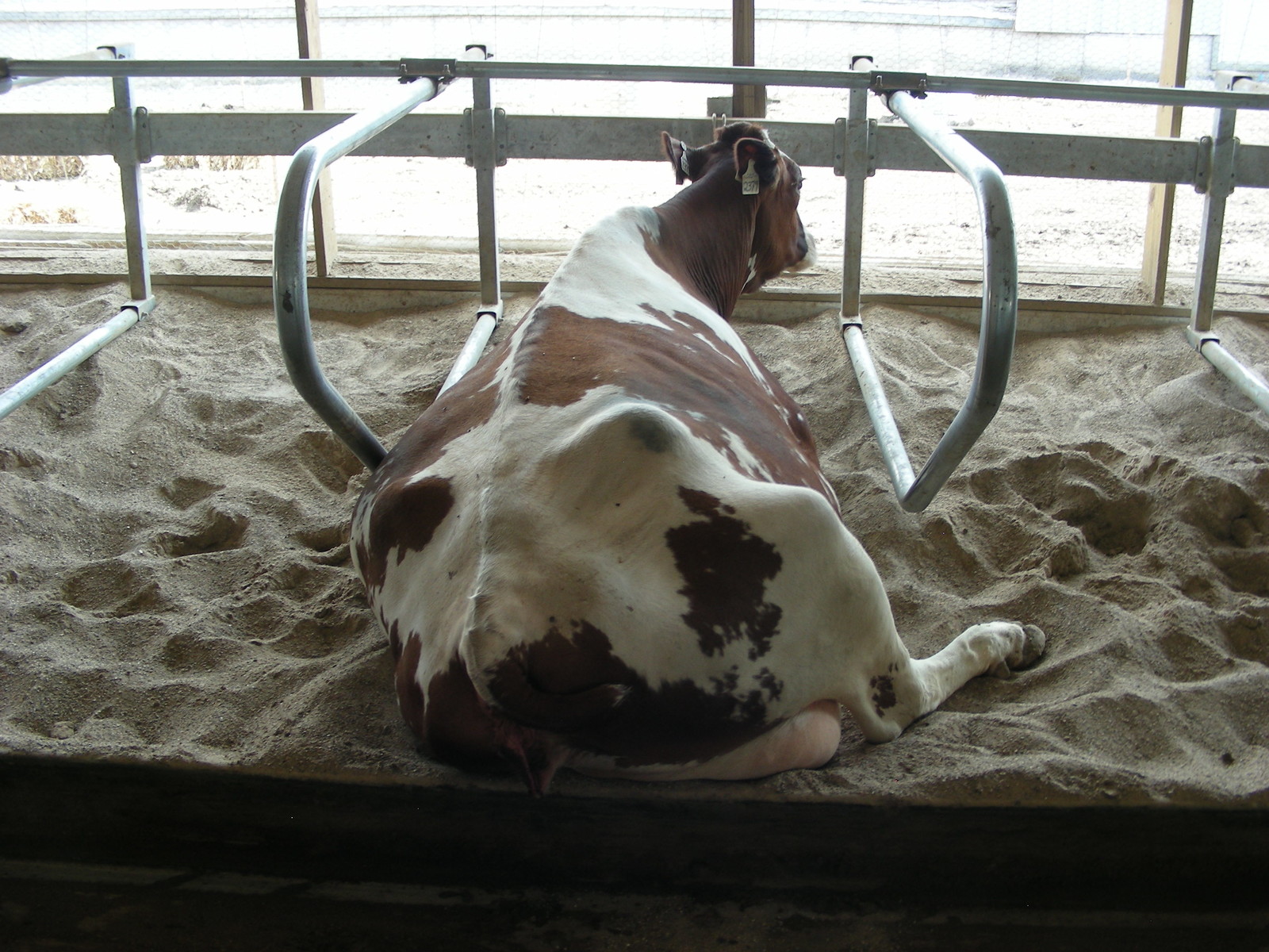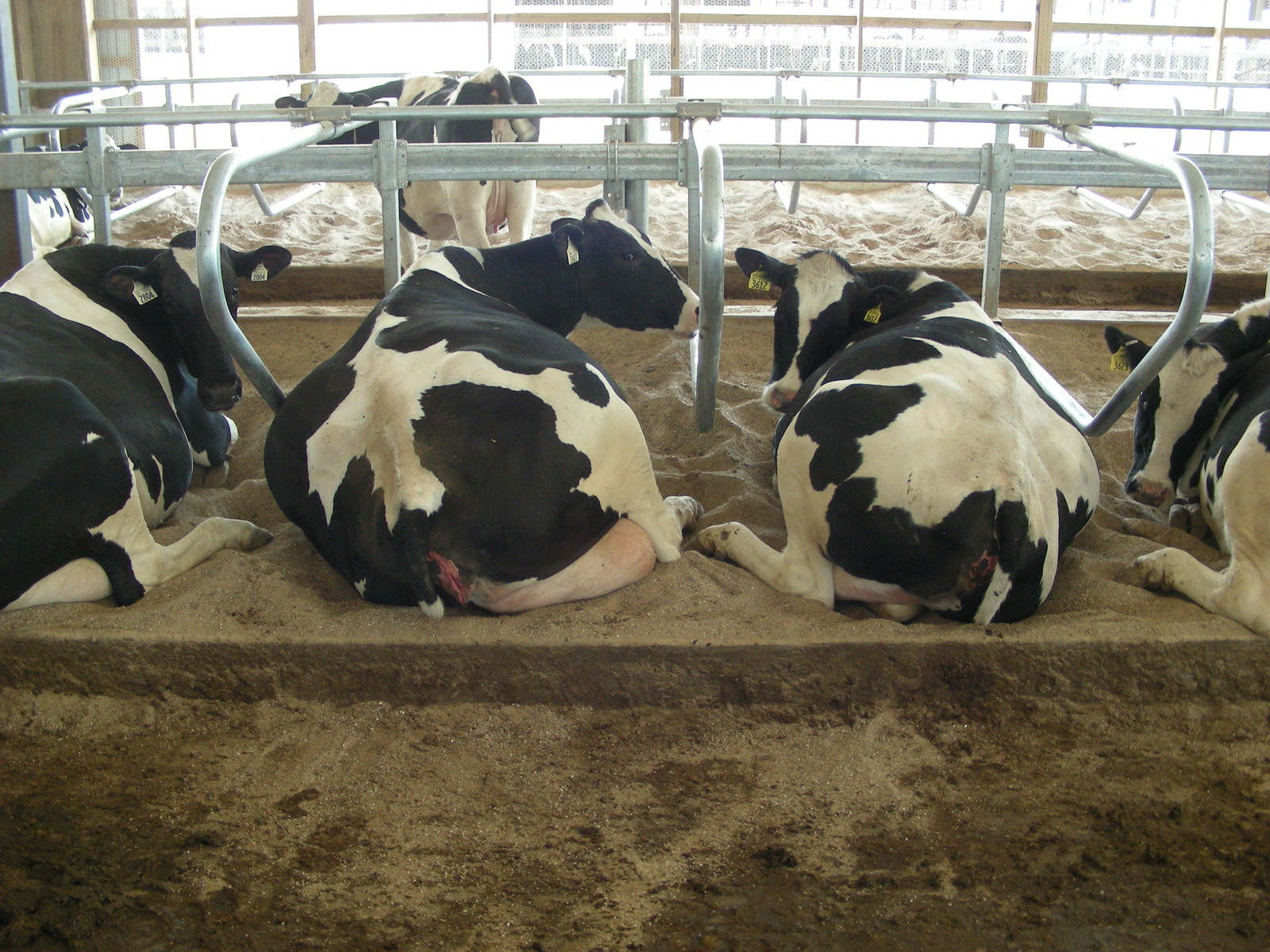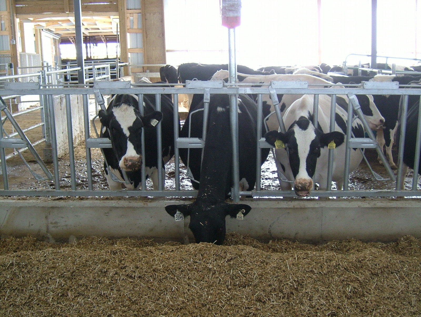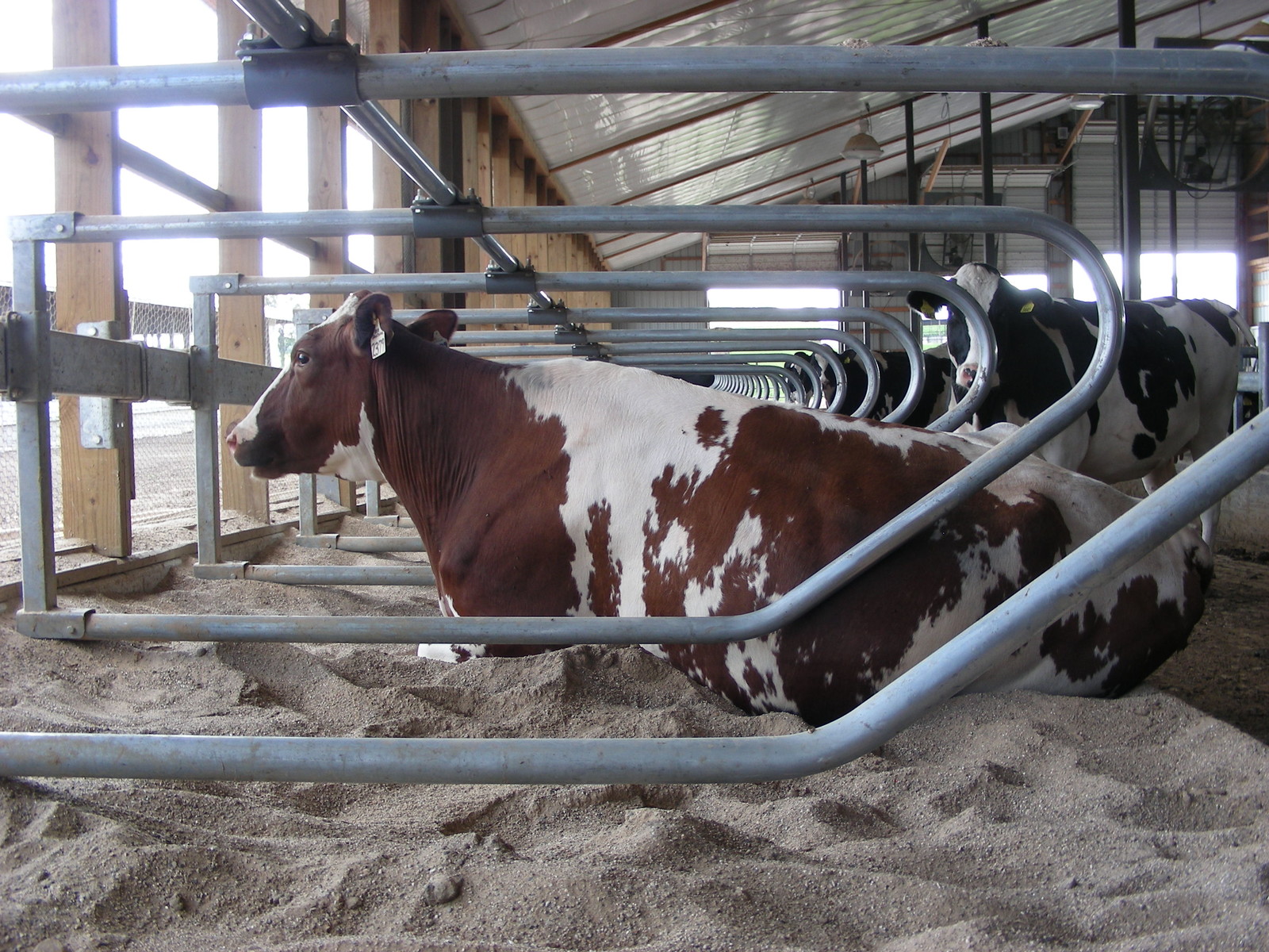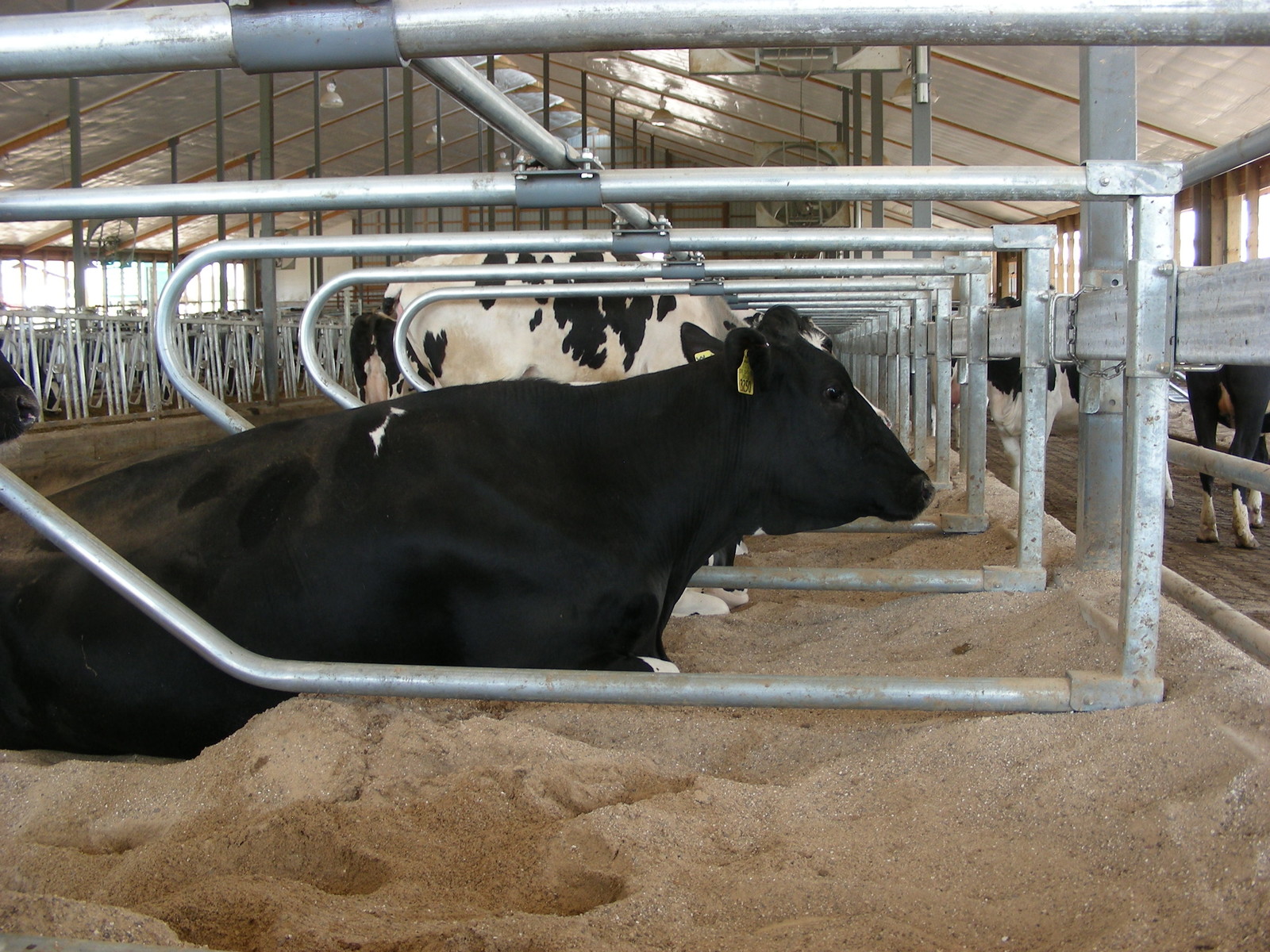 Expanded new transition cow barn housing far dry, prefresh and maternity cows. 5-row barn with 3-row far dry pen and a 2-row head to tail layout sand bedded freestall prefresh pen for a mixed group of heifers and mature cows. Just in time calving with Johne’s control calving pen. Sand bedded freestalls with Norbco loops and a single beam mounting system.