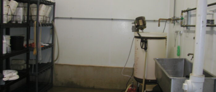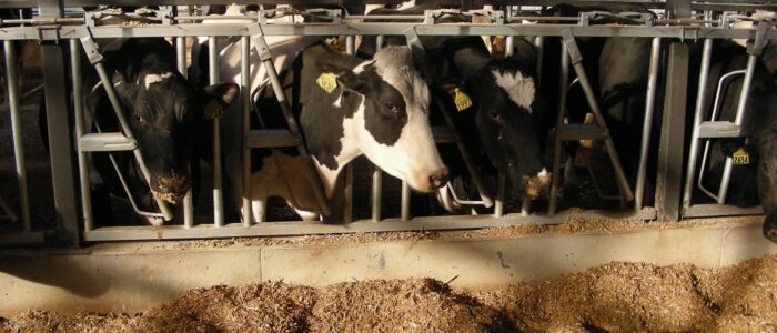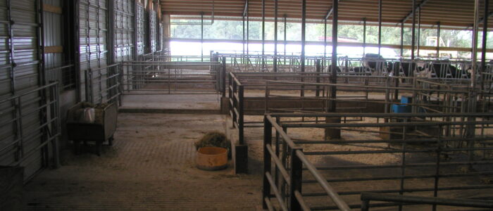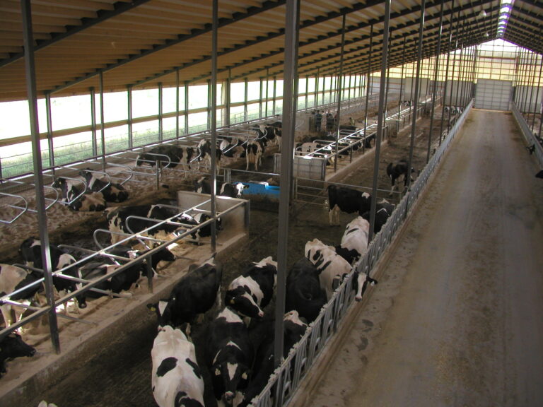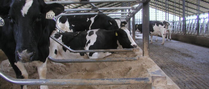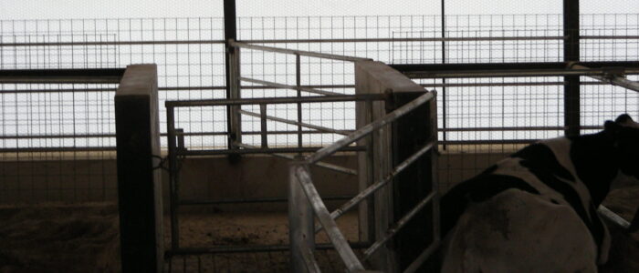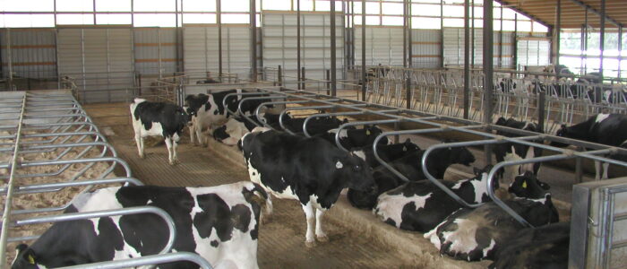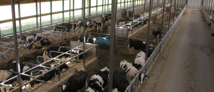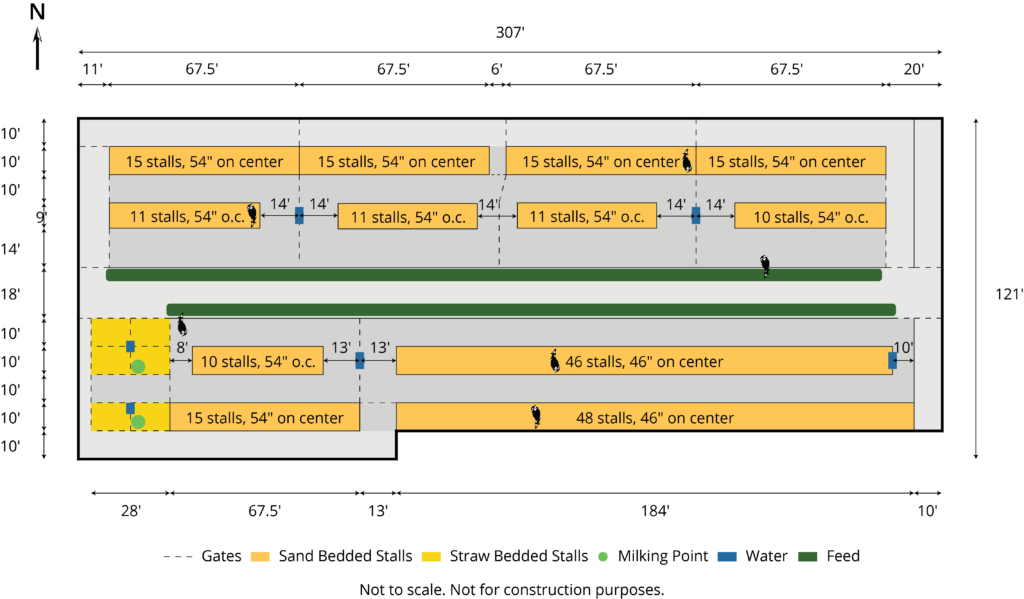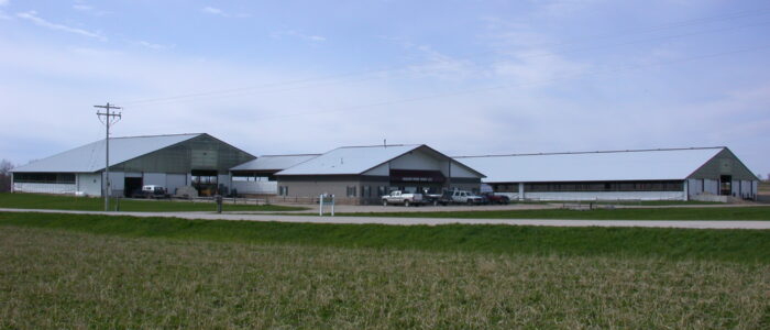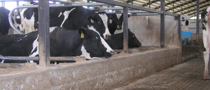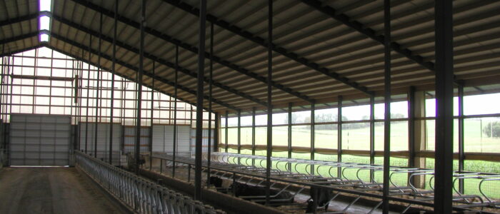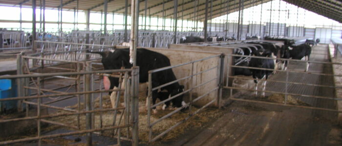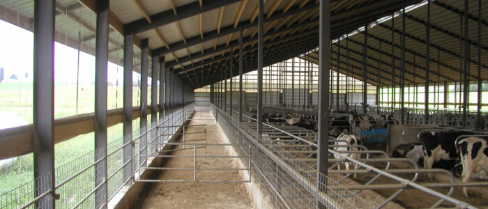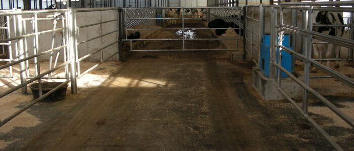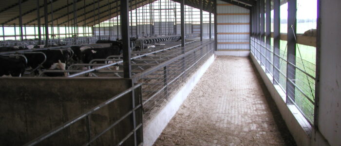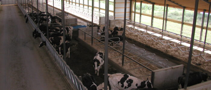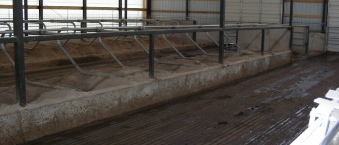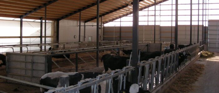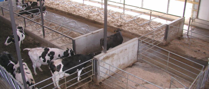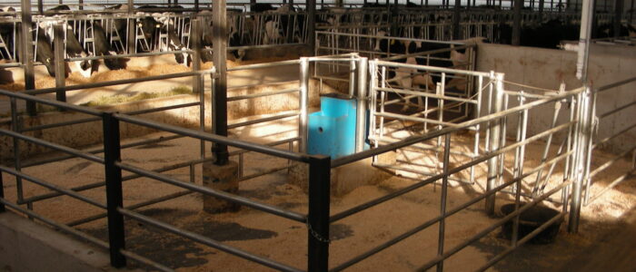 Expanded new transition cow barn housing one group dry period mature cows and heifers separately, with maternity area. Socially stable grouping system for mature cows with 5 x 2-row tail to tail layout sand bedded freestall pens for 25 cow groups. Just in time calving with drovers lane for easy cow movement and 4 x mattress floor calving pens with under floor heating.